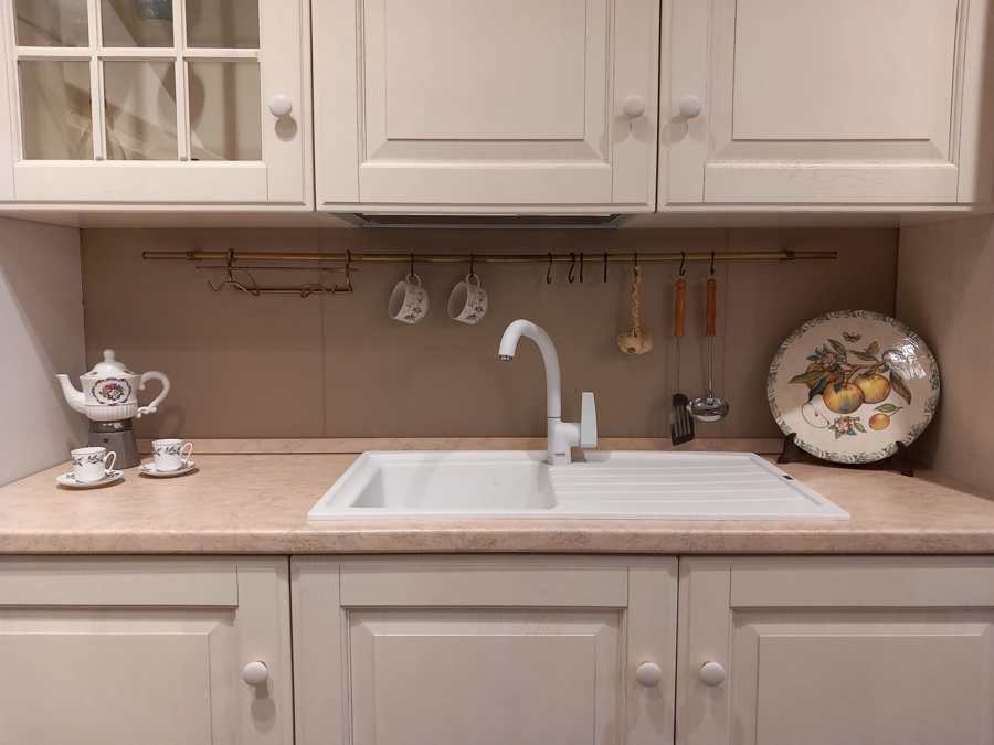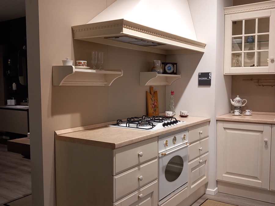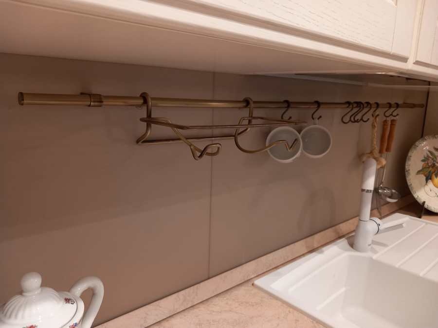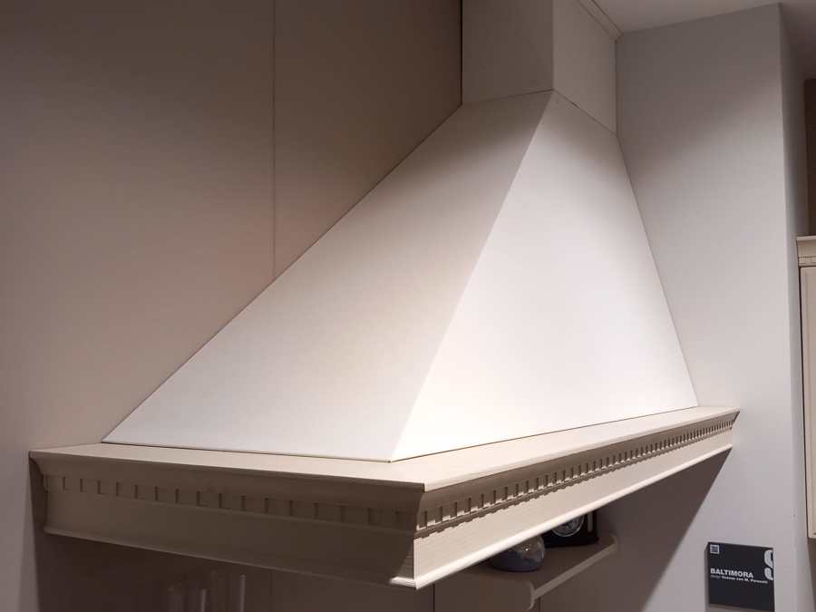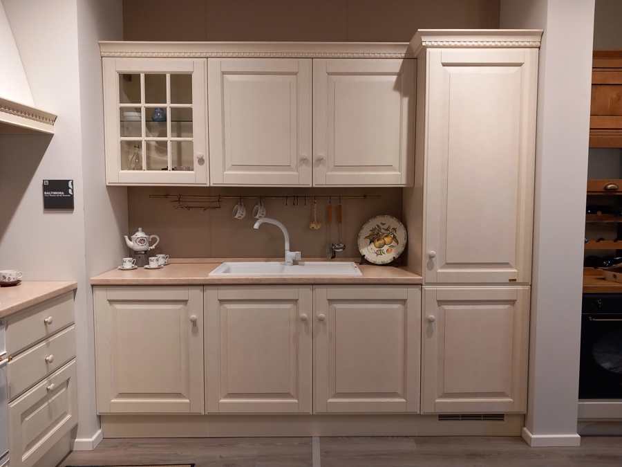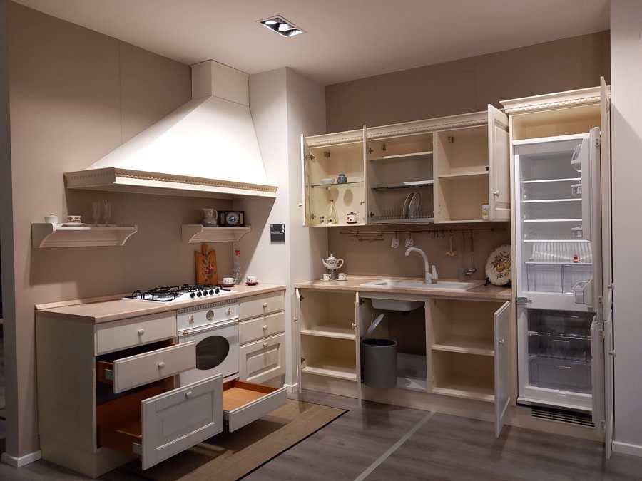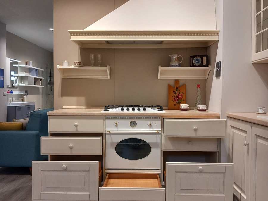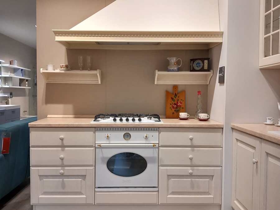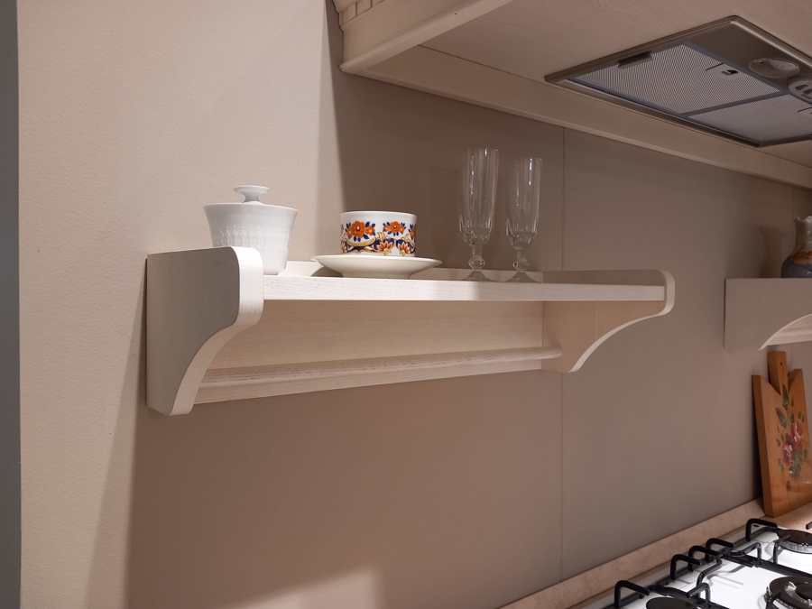 NOTE: La cucina è accessoriata con elementi a giorno uso mensole sagomati e barra porta mestoli in ottone anticato. La vetrinetta all’inglese e la cappa camino laterale sono i focus di questa composizione. La presente composizione è adattabile a tutti gli spazi abitativi. Siamo disponibili a modificare anche gli elettrodomestici con rimozione o sostituzione di uno o più degli stessi.
