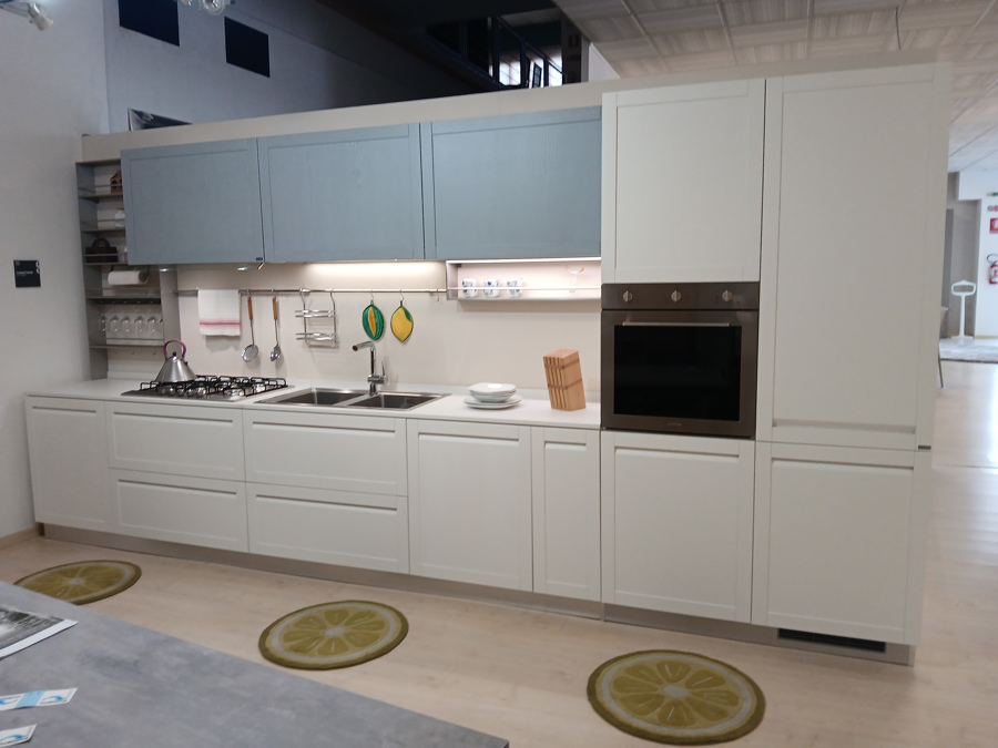 NOTE: Nel prezzo della composizione è compreso un sistema set-up da 60 cm con portacalici, ganci e portarotolo. E' presente una luce sotto pensili, e la base con cestello estraibile ospita al suo interno due cassetti.