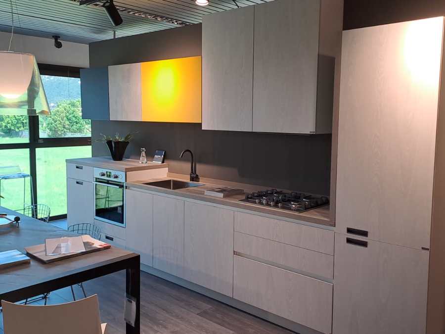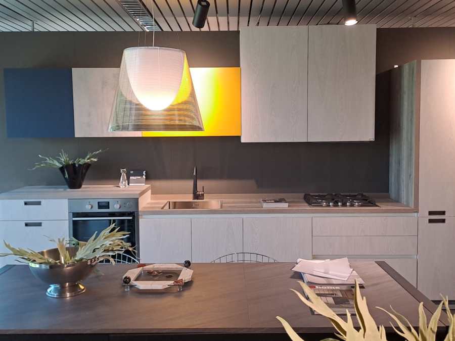 NOTE: Le ante delle basi sono in decorativo con finitura Concrete Medium, i pensili sono laccato opaco con finitura Bianco Prestige e il piano colazione è in laminato con finitura White Rock come il piano della cucina.