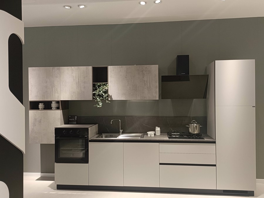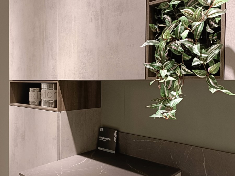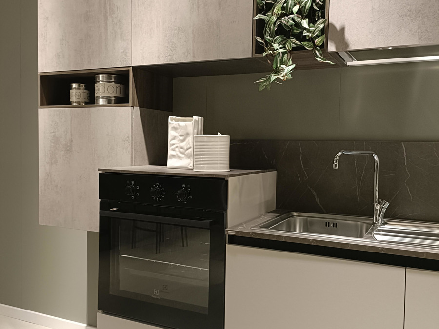 NOTE: Le basi nella cucina sono in decorativo con finitura Nebbia, mentre i pensili sono in decorativo con finitura Concrete Medium. I pensili a giorno sono in decorativo legno con finitura Noce Garden.