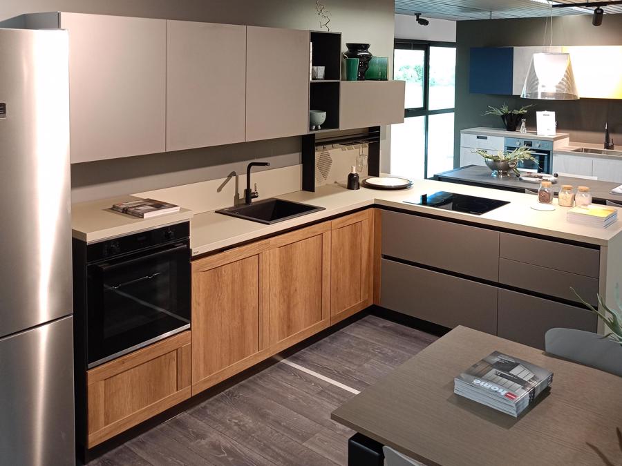 NOTE: Nella cucina è presente un sistema set-up con: set di ganci e porta calici inox. Le basi telaio sono in decorativo con finitura Rovere Land, mentre le basi lisce con i pensili sono in decorativo con finitura Polvere.