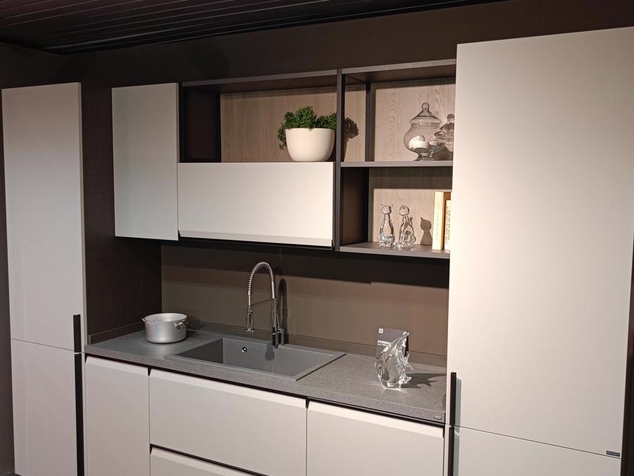 NOTE: Le ante della cucina sono in Pet con finitura Pioggia. I ripiani del sistema Status sono in decorativo con finitura Shadow.