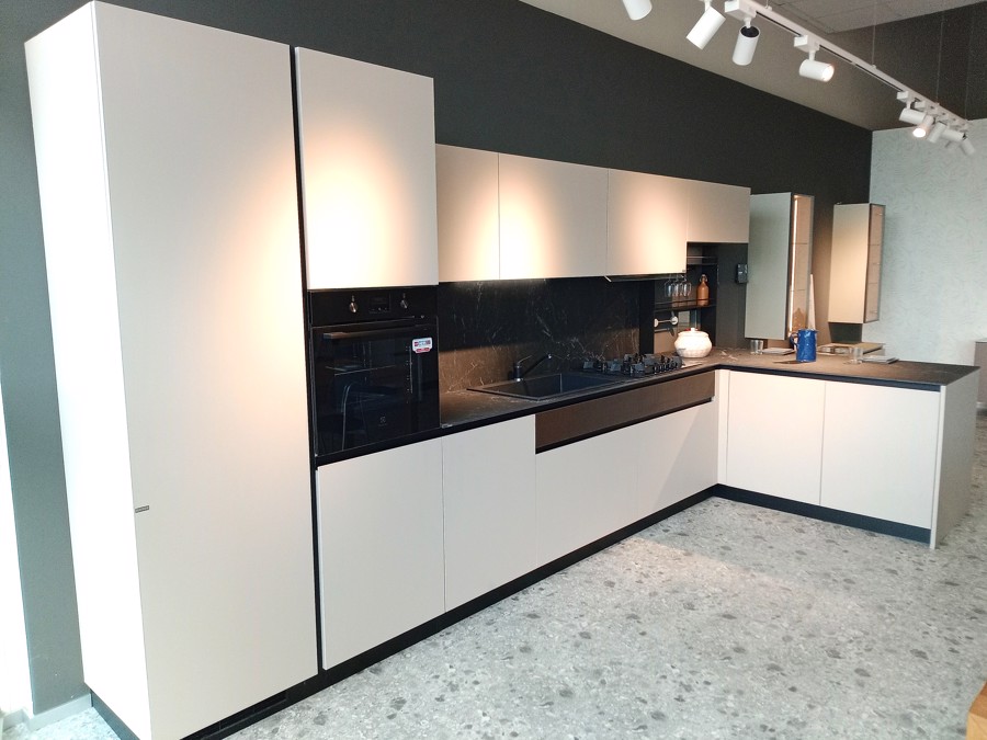 ELETTRODOMESTICI: Frigorifero da 60 combinato AEG, lavastoviglie da 60 a scomparsa AEG, lavello da 76 una vasca cube nero Telma, miscelatore nero Telma, piano cottura da 75 in vetro nero AEG e cappa Divina Sensor da 90 acciaio Faber.